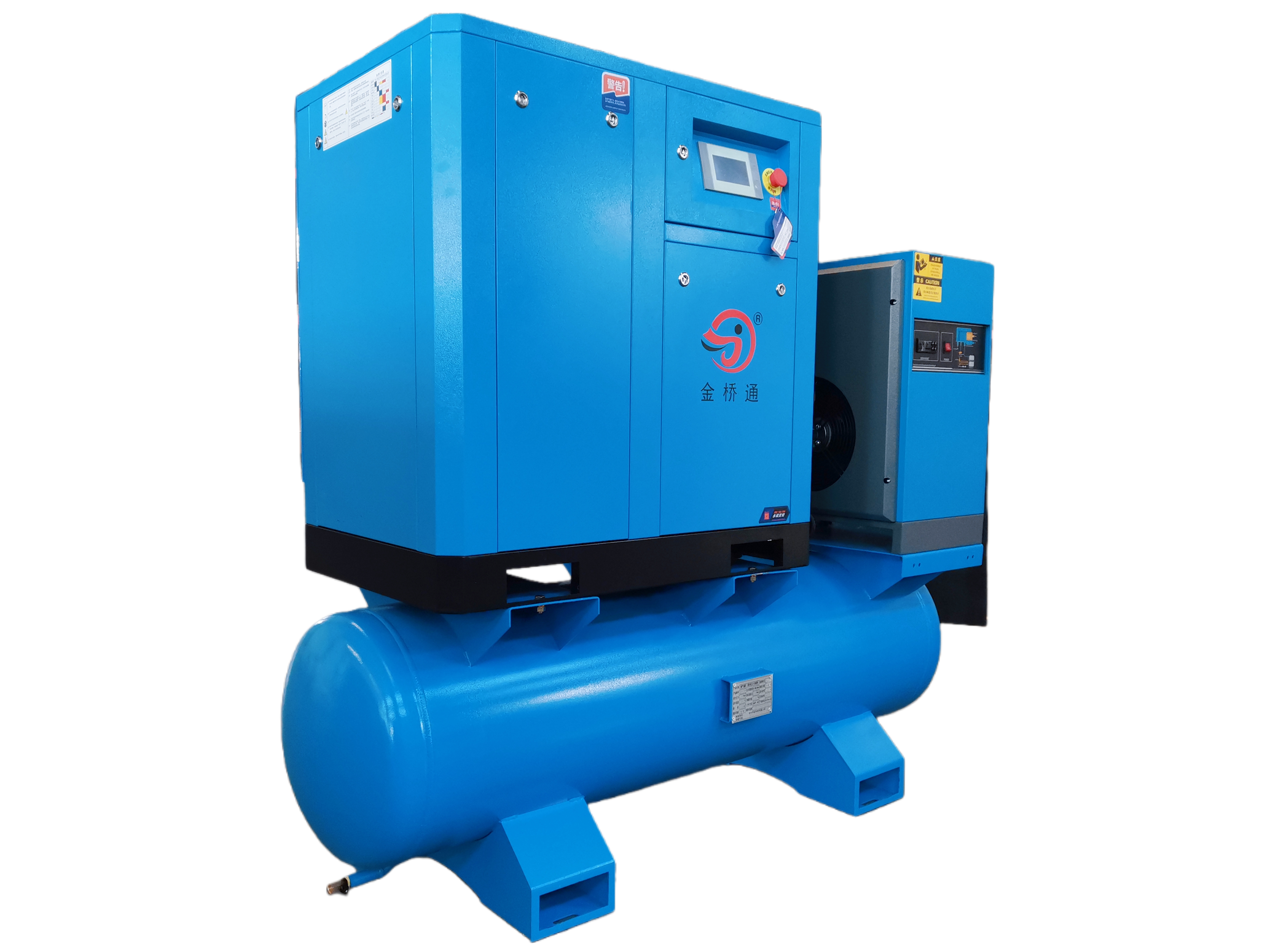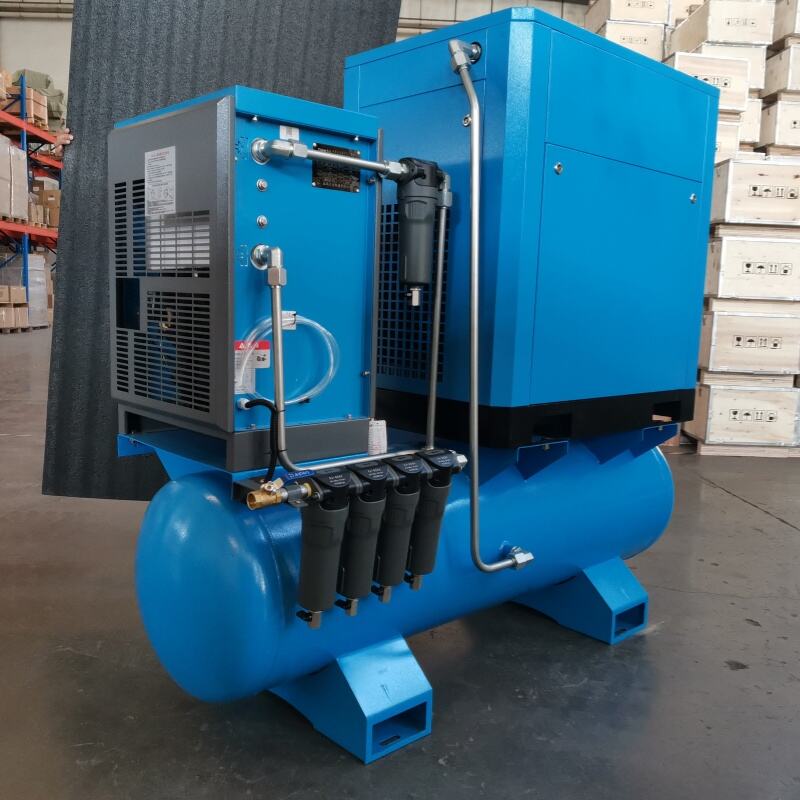 An air compressor consists of five parts:efficient freeze dryer,high precision filter,high-efficiency permanemt magnet motor,twin screw host,gas tank.It uses high-efficiency refrigerated desiccant and 5-level high-efficiency precision filter, the pressure dew point is as low as 2-5℃, the gas oil content is as low as 0.001PPM, and the particle filtration accuracy reaches 0.01um, ensuring that pure, dry compressed air is obtained to protect the lens from being damaged pollute.The integrated air compressor combination design can meet the needs of various enterprises, save more space, and is more energy-saving and power-saving than general lubricating air compressors.